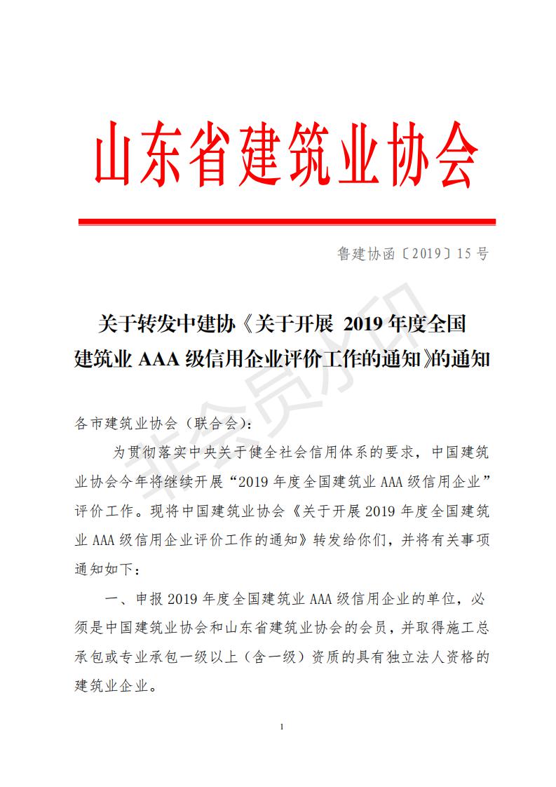 關(guān)于轉(zhuǎn)發(fā)中建協(xié)《關(guān)于開展2019年度全國 建筑業(yè)AAA級信用企業(yè)評價(jià)工作的通知》的通知