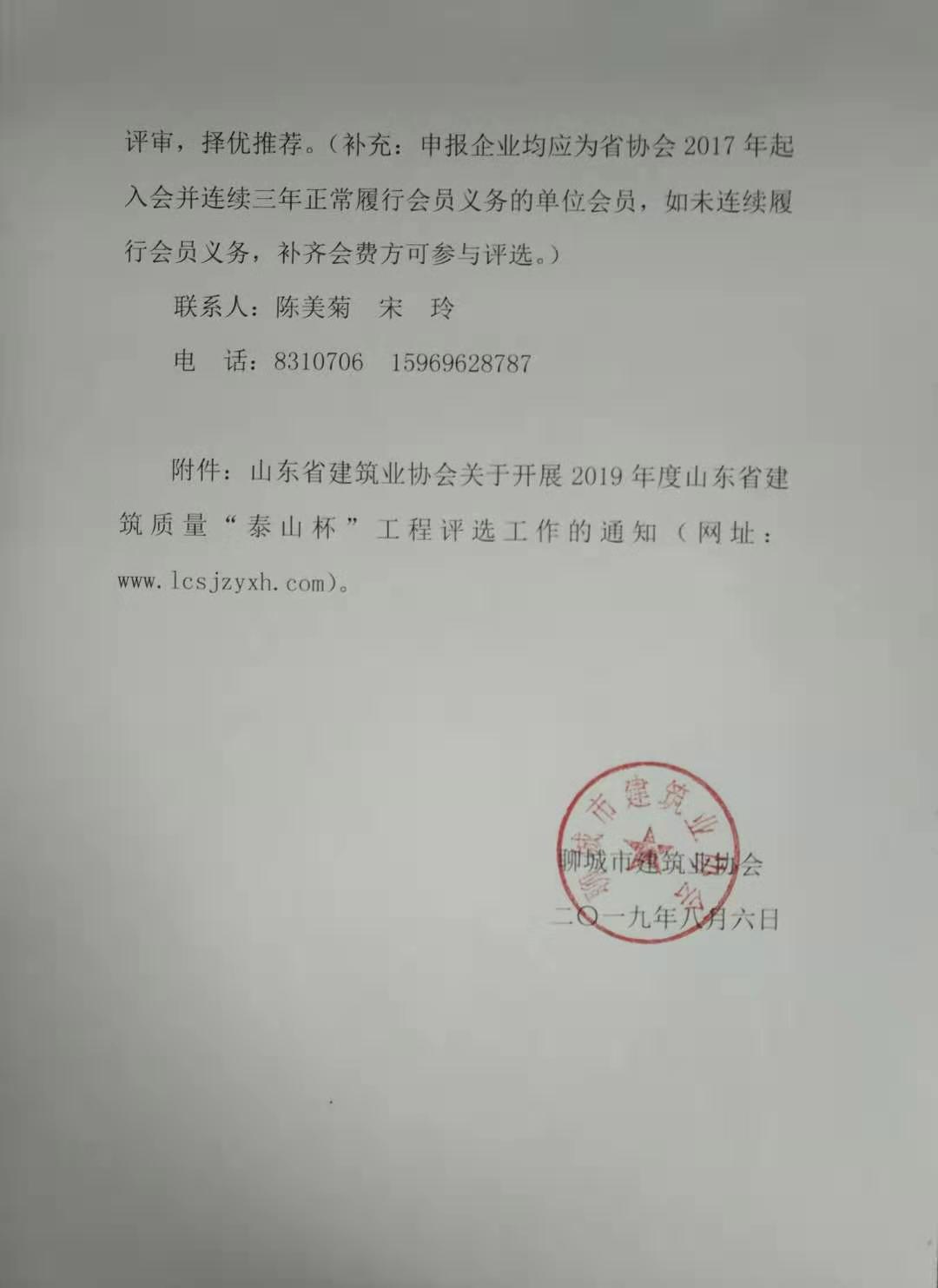 關(guān)于轉(zhuǎn)發(fā)《山東省建筑業(yè)協(xié)會關(guān)于開展2019年度 山東省建筑質(zhì)量 “泰山杯”工程評選工作的通知》的通 知