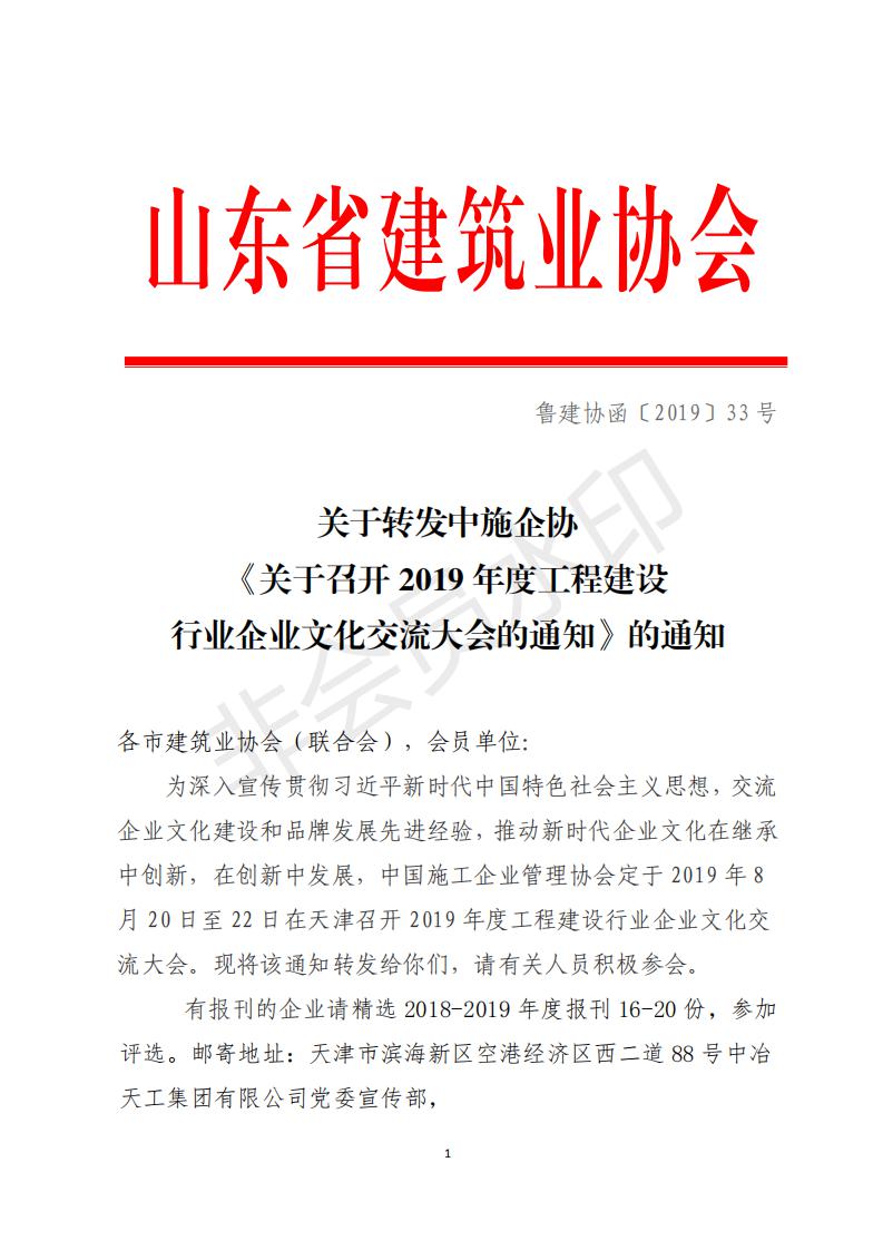 關于轉發(fā)中施企協《關于召開 2019 年度 工程建設行業(yè)企業(yè)文化交流大會的通知》的通知