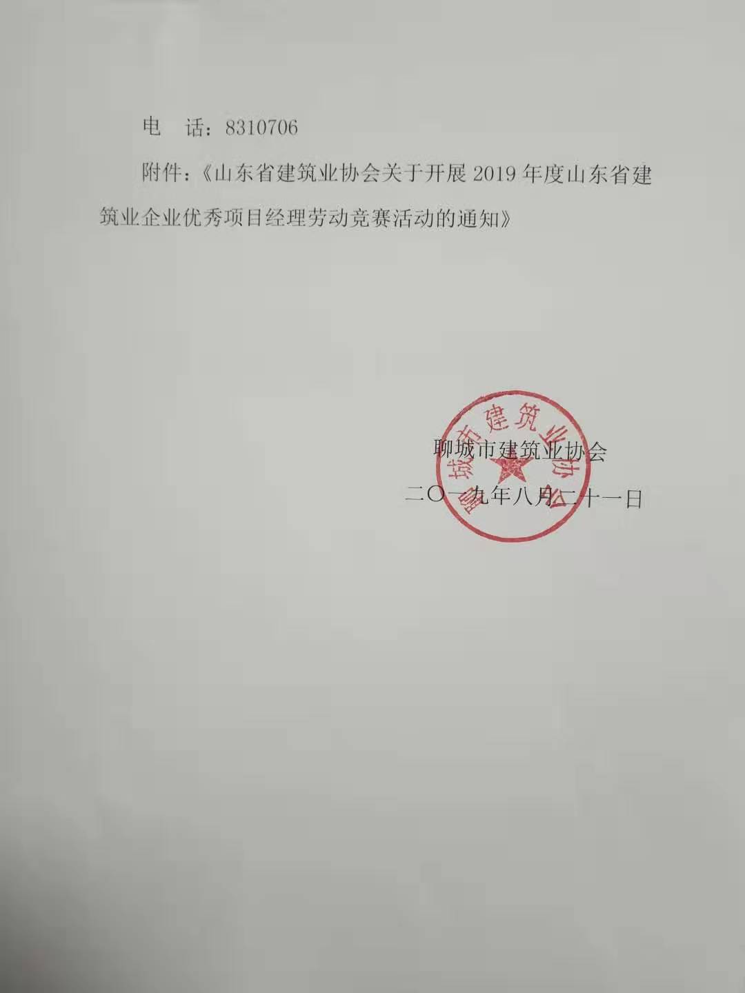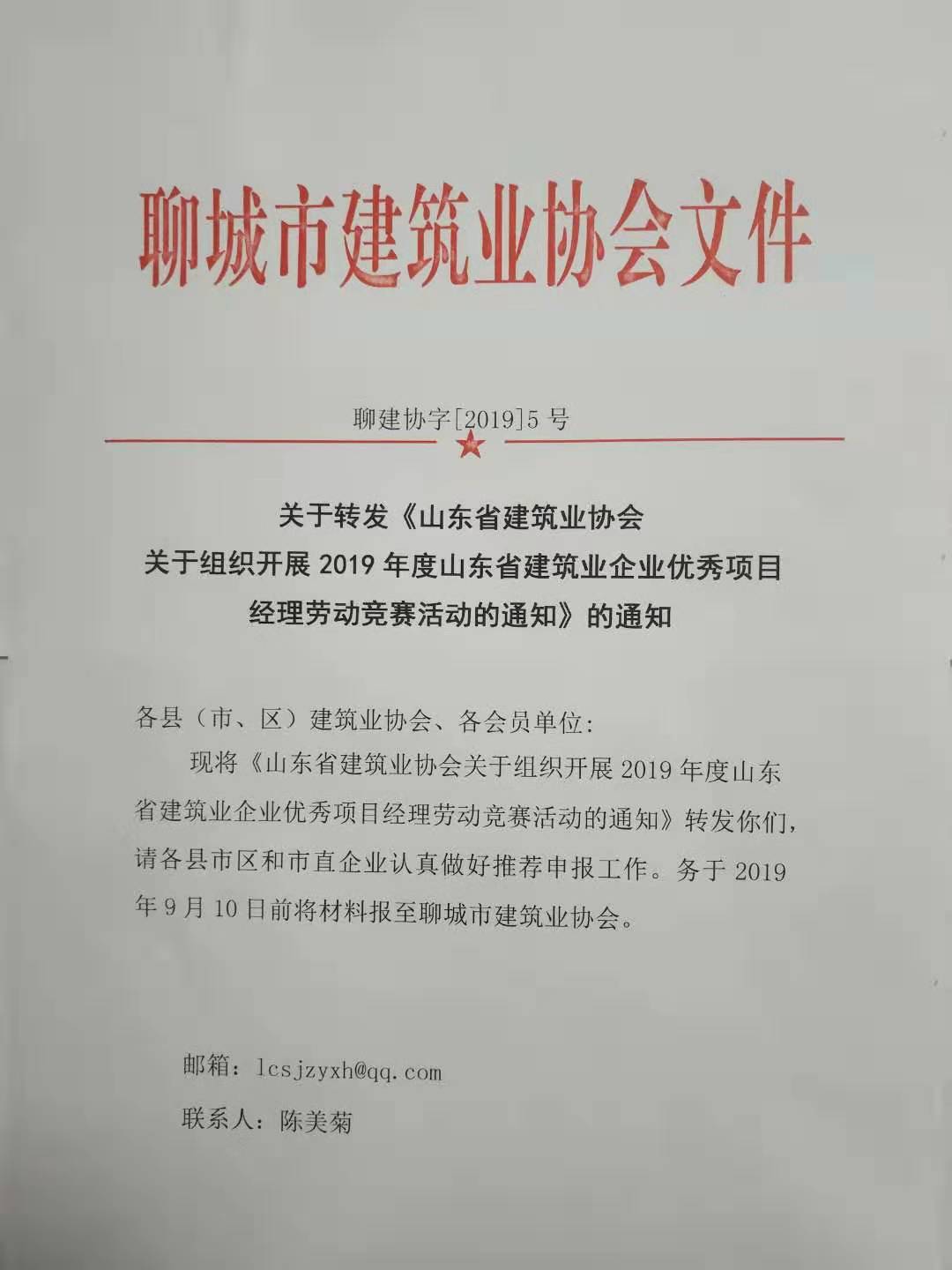 關(guān)于轉(zhuǎn)發(fā)《山東省建筑業(yè)協(xié)會(huì) 關(guān)于組織開展 2019 年度山東省建筑業(yè)企業(yè)******項(xiàng)目 經(jīng)理勞動(dòng)競(jìng)賽活動(dòng)的通知》的通知