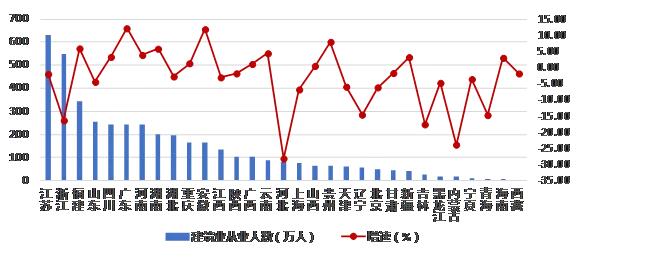 2019 年上半年,全國建筑業(yè)從業(yè)人數(shù)超過百萬的地區(qū)共 14個(gè)。江蘇、浙江依然是從業(yè)人數(shù)大省,人數(shù)分別達(dá)到630.67 萬人和 550.40萬人。福建、山東、四川、廣東、河南、湖南等6個(gè)地區(qū)從業(yè)人數(shù)均超過200萬人。與上年同期相比,13 個(gè)地區(qū)的從業(yè)人數(shù)增加,其中,增加人數(shù)最多的是廣東,增加 26.48萬人 ;18 個(gè)地區(qū)的從業(yè)人數(shù)減少,其中,減少最多的是浙江,減少107.64萬人。從業(yè)人數(shù)增幅******的是廣東和安徽,分別為 12.15%和11.86%;降幅******的是河北和內(nèi)蒙古,分別下降了 28.15%和23.89%(圖 5)。